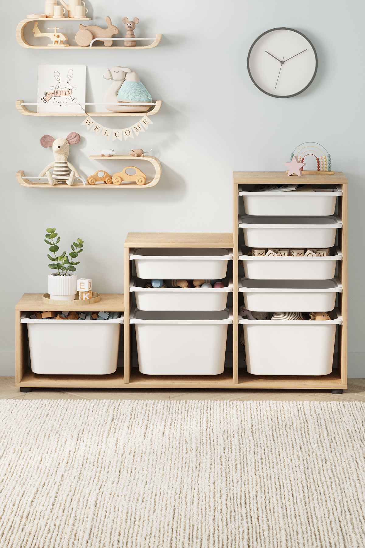 Organizér ALARA sa skvelo hodí nielen do detskej izby, ale i do herní alebo obývacích priestorov, kde pomáha vytvárať poriadok bez zbytočnej námahy. Úložný box ponúka dostatok úložného priestoru pre všetky hračky, knižky či školské potreby. Je vyrobený z kvalitnej 18 mm LTD dosky, boxy sú vyrobené z plastu.