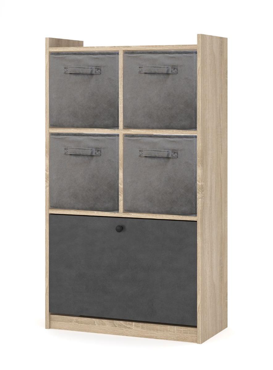 COMPO 6 je praktický botník, ktorý okrem dvoch výklopných skriniek obsahuje aj regál, ktorý je vyplnený viacúčelovými látkovými organizérmi v šedej farbe. Organizér je zahrnutý v cene botníka.