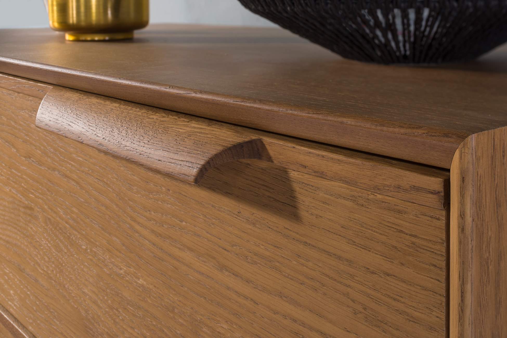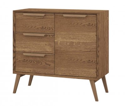 Komoda LEO v rustikálnom štýle vyniká svojou jednoduchosťou a prirodzeným vzhľadom. Dvere komody sú vyrobené z prírodnej dubovej dýhy v kombinácii s prírodným dubovým masívom. Korpus je z kvalitnej drevotriesky a dubovej dýhy. Úchytky sú vyrobené z dubového masívu. Komoda stojí na vysokých nohách, ktoré jej dodávajú vzdušný vzhľad. Pánty a výsuvy v zásuvkách sú vybavené systémom mäkkého dorazu. Rustikálne lakovanie nábytku zvýrazňuje dubovú štruktúru dreva.