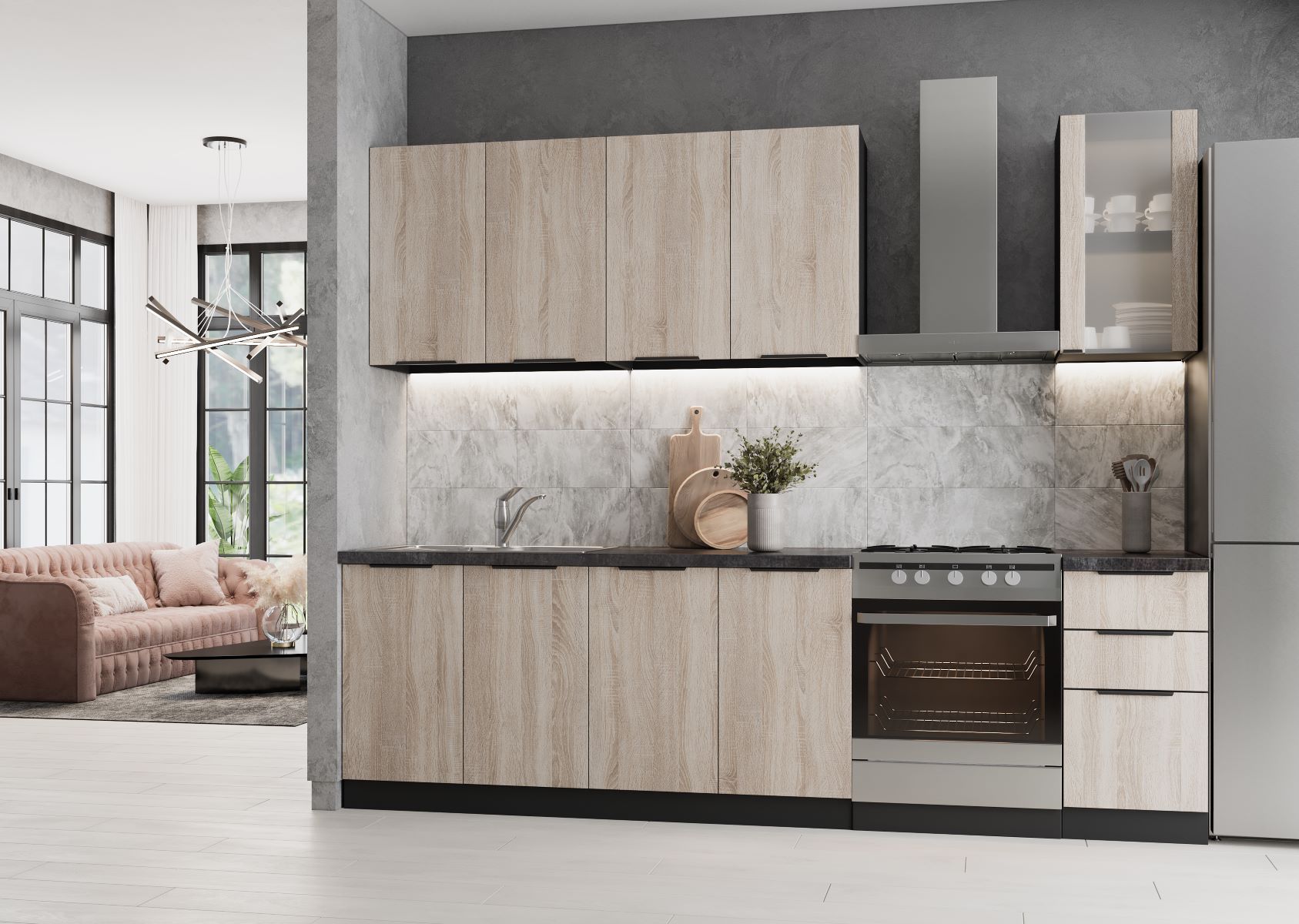 Kuchynská linka je vyrobená z kvalitnej LTD dosky, ktorá je nenáročná na údržbu. Súčasťou kuchyne je sokel. Farebné prevedenie dub sonoma / antracit.