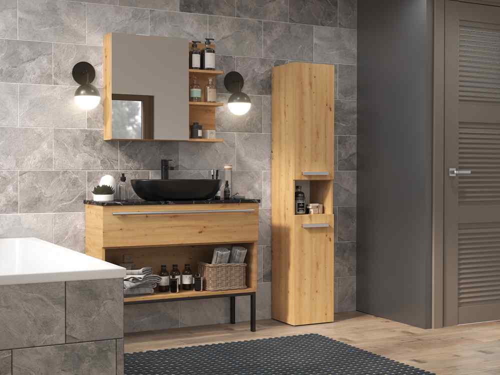 Teplý odtieň dubu Artisan dodáva skrinke NEL III prírodný a zároveň moderný vzhľad, ktorý sa ľahko hodí do rôznych štýlov kúpeľní.