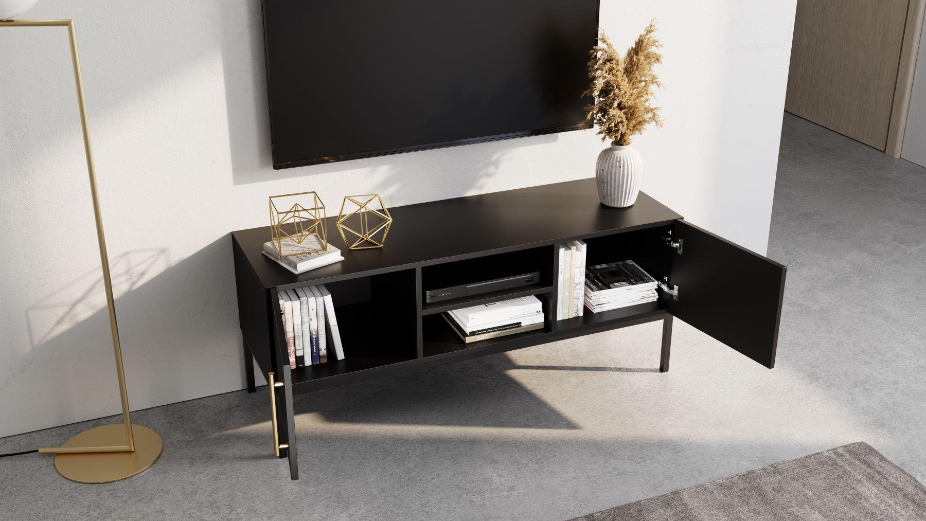 Zlaté úchyty na čiernom matnom povrchu vytvárajú príjemný kontrast.