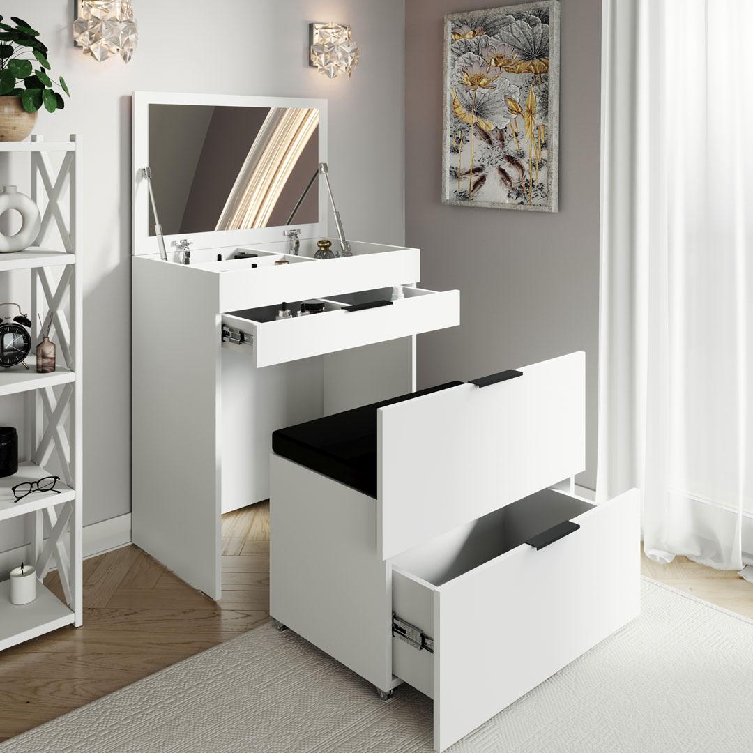 Vo vrchnej výklopnej doske je umiestnené zrkadlo, takže stolík je možné rýchlo a jednoducho používať nielen ako kozmetický stolík, ale aj ako pracovný či odkladací priestor. Súčasťou je vysúvateľná taburetka s čiernym čalúneným sedením, ktorá zabezpečuje komfort pri používaní. Úložný priestor tvoria dve praktické zásuvky a ďalší priestor ukrytý pod výklopnou doskou.