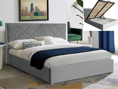 Vyvýšené čelo zabezpečí pohodlné opretie chrbta a hlavy a súčasne ochráni stenu pred oderom. Posteľ je celočalúnená, kvalitnou zamatovou látkou Bluvel 03 v svetlošedej farbe. Spacia plocha postele je 160 x 200 cm. Disponuje praktickým úložným priestorom a vyklápacím roštom.