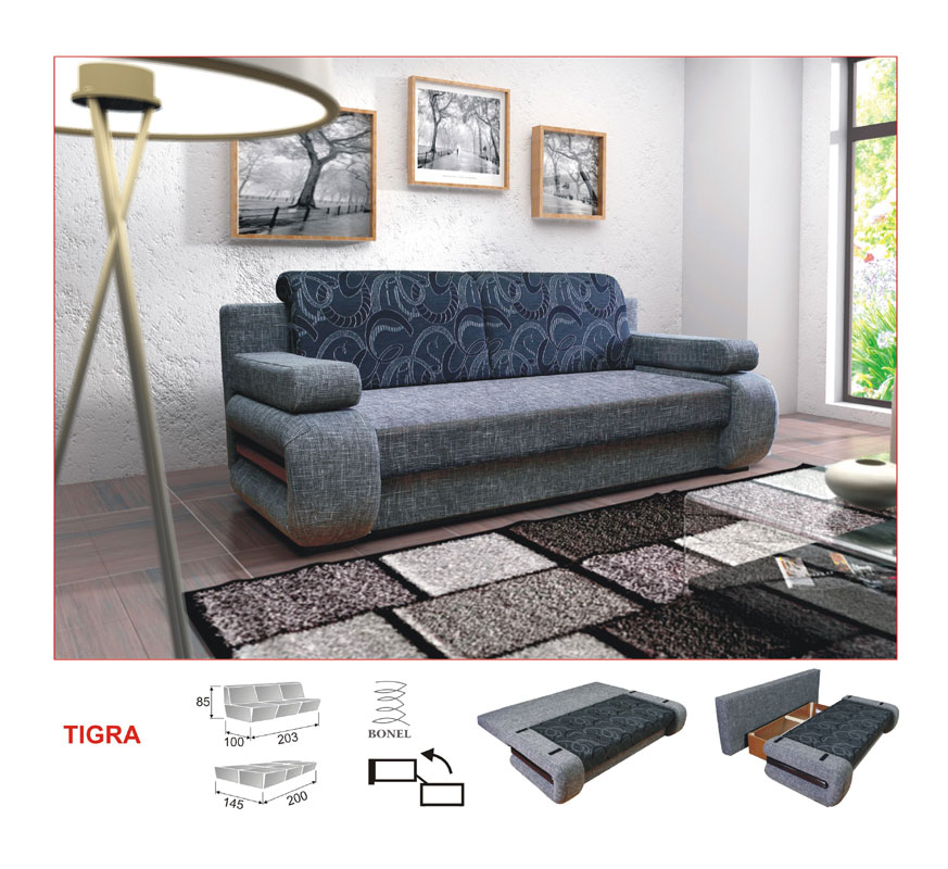 detailom veľa miesta, no napriek tomu je dostatočne veľká na to, aby ste na nej mohli pohodlne relaxovať. Máme ďalšiu dobrú správu, okrem úspory miesta je trendová rozkladacia pohovka s mäkkými opierkami šetrná aj k vašej peňaženke. Pohodlná, praktická, štýlová, flexibilná, úsporná ? všetky tieto prívlastky môžeme zhrnúť do jedného slova - Tigra.