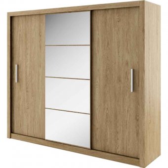 Atraktívna šatníková skriňa IDEA 01 je vhodná do moderných spálni či predsieni. Skriňa je vyrobená z kvalitnej lamino dosky vo farbe dub shetland. Na stredných dverách je umiestnené elegantne členené zrkadlo.