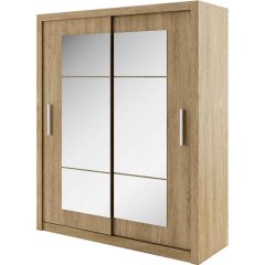 Skriňa so zrkadlom, posuvné dvere, šatná tyč + police. Farba: dub sonoma. Rozmery (v/š/h): 215 x 150 x 61 cm.
